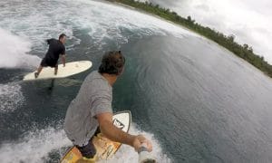 Ao acordarmos no dia seguinte, estávamos chegando a mais uma onda que nunca havia surfado. Esta não estava na lista das boas de Mentawai, mas, mesmo com mar pequeno em todos os outros locais, pegamos ondas entre 3 a 6 pés com bastante volume. O pico até lembrava um Sunset Point quebrando de noroeste, onde a parede entrava alinhada no ponto do drop e depois vinha fazendo uma curva à frente e aumentando de tamanho. Nesse momento, muitas vezes ela engordava, mas quando chegava ao inside, em uma seção bem rasa, às vezes proporcionava um tubo e algumas rasgadas fortes, sempre com muita emoção. Nesse pico, aproveitei pra pegar a minha câmera e gravar a turma seguindo por trás ou pela frente das ondas. Foi bem divertido e gerou boas imagens. Mais tarde, aliadas às da terra que Bruno Veiga fazia, elas fizeram do pós-janta mais um momento agradável a bordo da embarcação.
